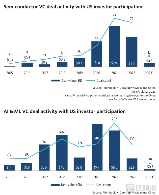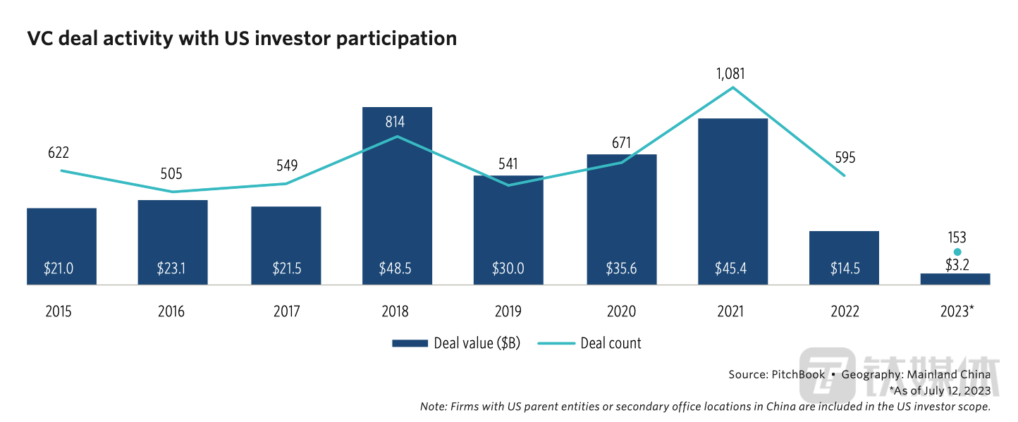 报告显示,截至7月12日的2023年,美国投资者参与的中国的风险投资(VC)交易数量达153笔,对华投资总额为32亿美元。无论是投资数量、还是投资额,均是过去9年内(报告期)最低点。而最高峰时刻是2018年,总额高达创纪录的485亿美元。
