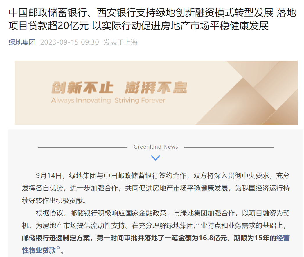 官微显示,9月14日,绿地集团与中国邮政储蓄银行签约合作,双方充分发挥各自优势,进一步加强合作,共同促进房地产市场平稳健康发展。