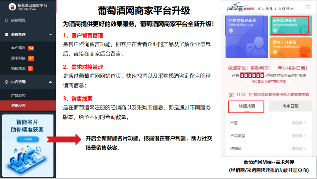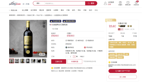 为了应对葡萄酒行业困难,满足各大酒商及用户需要,抢占市场,葡萄酒网一直在不断优化创新,每一个酒款页面都有全方位获客方式”获取报价”、“立即订货”、“申请样酒”、“联系商家”、“代理咨询”功能,通过大数据精准匹配,锁定需求信息;