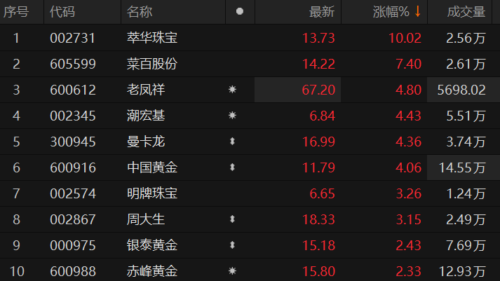 原标题:黄金概念股走高 萃华珠宝涨停
