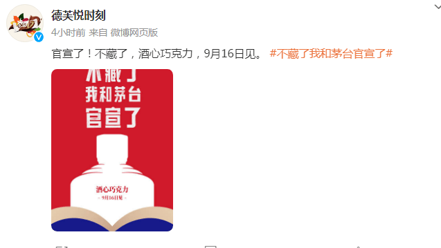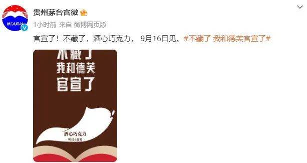 14日上午,天猫官方微博也转发了茅台的官宣海报。还说:我也不藏了,9月16日,酒心巧克力,不见不散!
