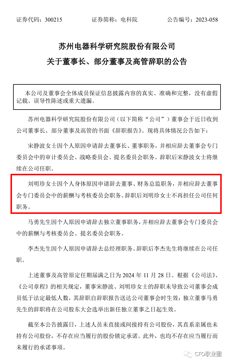 9月1日晚间,电科院发布公告称,宋静波女士因个人原因申请辞去董事长、董事职务,并相应辞去董事会专门委员会中的审计委员会、战略委员会、提名委员会职务。刘明珍女士因个人身体原因申请辞去董事、财务总监职务,并相应辞去董事会专门委员会中的薪酬与考核委员会职务。辞职后刘明珍女士不再担任公司任何职务。马勇先生因个人原因申请辞去独立董事职务,李杰先生因个人原因申请辞去总经理职务。