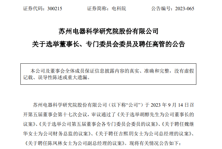 苏州电器科学研究院股份有限公司(以下简称“电科院”)2023年9月14日晚间公告,鉴于公司多位董事及董事长宋静波辞职,公司已于9月12日召开临时股东大会选举出新任各位董事,公司现阶段经营急需回归正轨,现选举胡醇担任公司董事长,选举公司第五届董事会各专门委员会成员,聘任魏继华为公司财务总监,指定董事许冬冬代为履行董事会秘书职责,聘任吉熙玥为公司总经理,聘任陈凤林为公司副总经理。