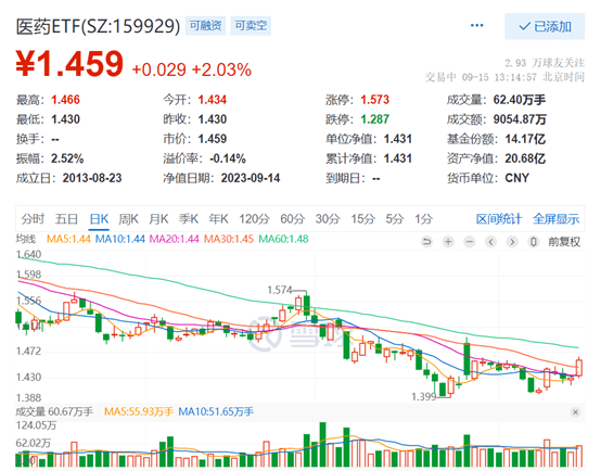 热门ETF方面,医药ETF(159929)今日强势大涨超2%!上穿4条短期均线,创9月以来新高!成交额超9000万元,已超昨日全天成交额,大幅放量!