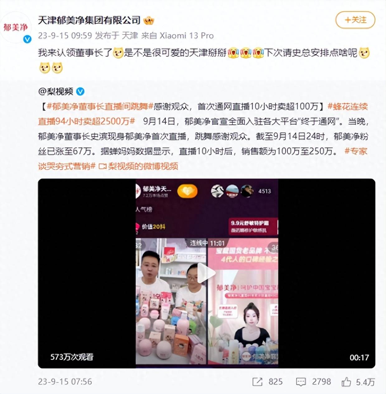 9月14日晚,郁美净董事长史滨现身郁美净首次直播,在直播间跳舞感谢观众。一时间,“郁美净董事长直播间跳舞”这一词条登顶热搜。
