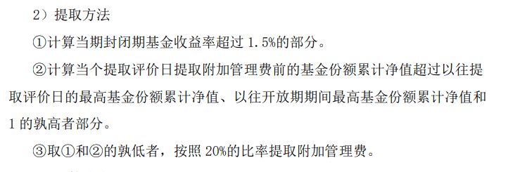 另外,在附加管理费方面,该基金按照下面这个提取方式,最终也是按照20%的比例收取附加管理费,但是并没有同时规定计提比例年化超过多少时,按固定比例计提。