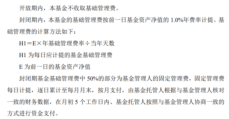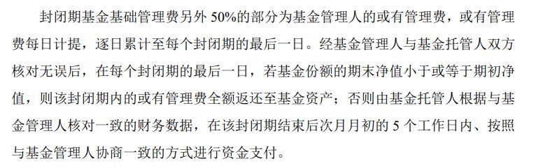 另外,50%为或有管理费,在每个封闭期的最后一日,若基金份额的期末净值小于或等于期初净值,则该封闭期内的或有管理费全额返还至基金资产。