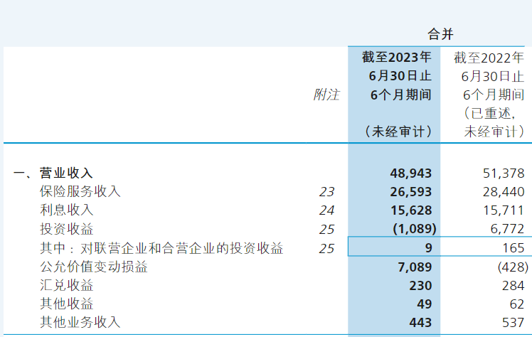 数据显示,公司营收下降主要系保险服务收入及投资收益下降所致,其中,保险服务收入为265.93亿元,同比下降6.5%;投资收益亏损10.89亿元,去年同期盈利67.72亿元。