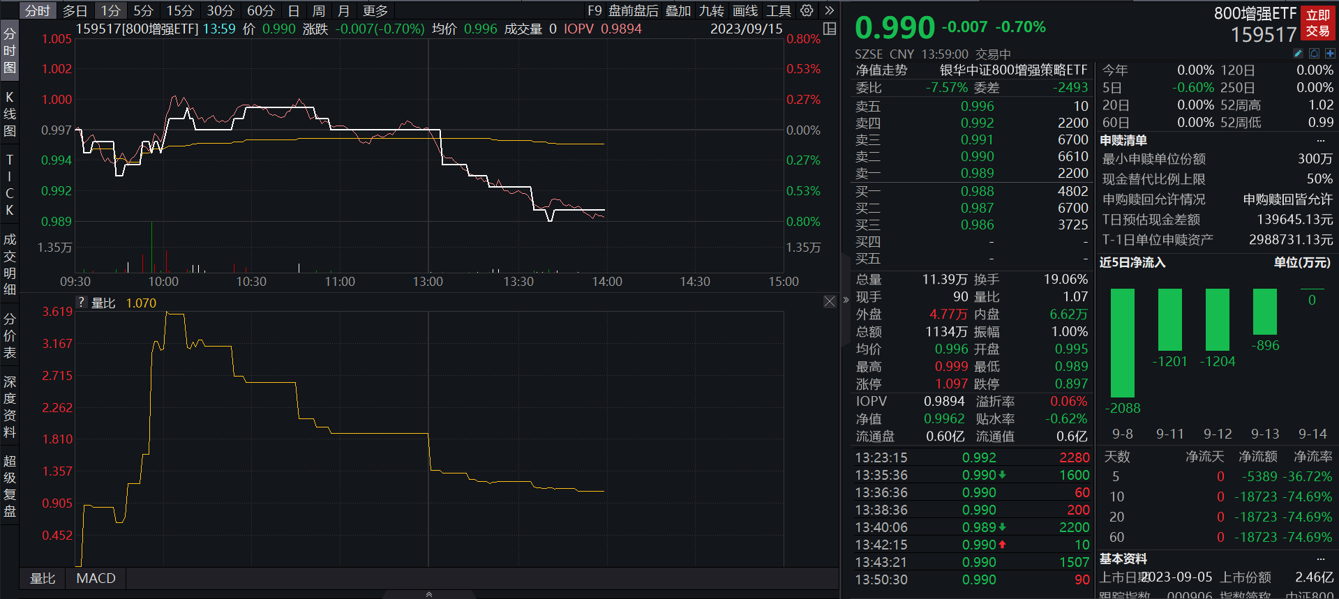 截至2023年9月15日13:59,800增强ETF(159517)宽幅震荡,现跌0.70%,换手率高达19.06%,盘中溢价0.06%,市场交投活跃。