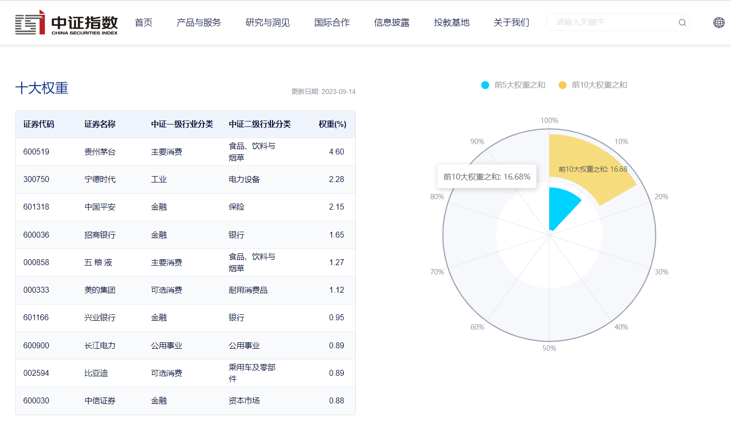 数据显示,截至2023年9月14日,该指数前十大权重股包括贵州茅台、宁德时代、中国平安、招商银行、五粮液等,前十大权重股占比合计约为16.68%。(数据来源:中证指数公司,指数成份股不代表个股推荐)
