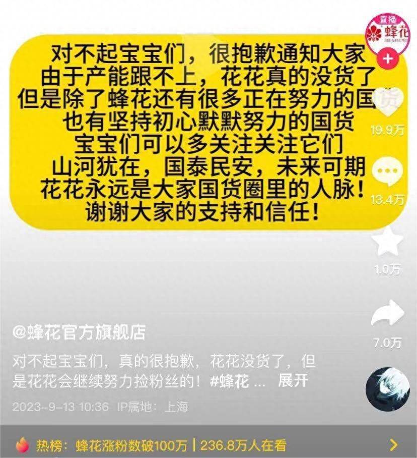因售卖火爆蜂花发布的断货公告