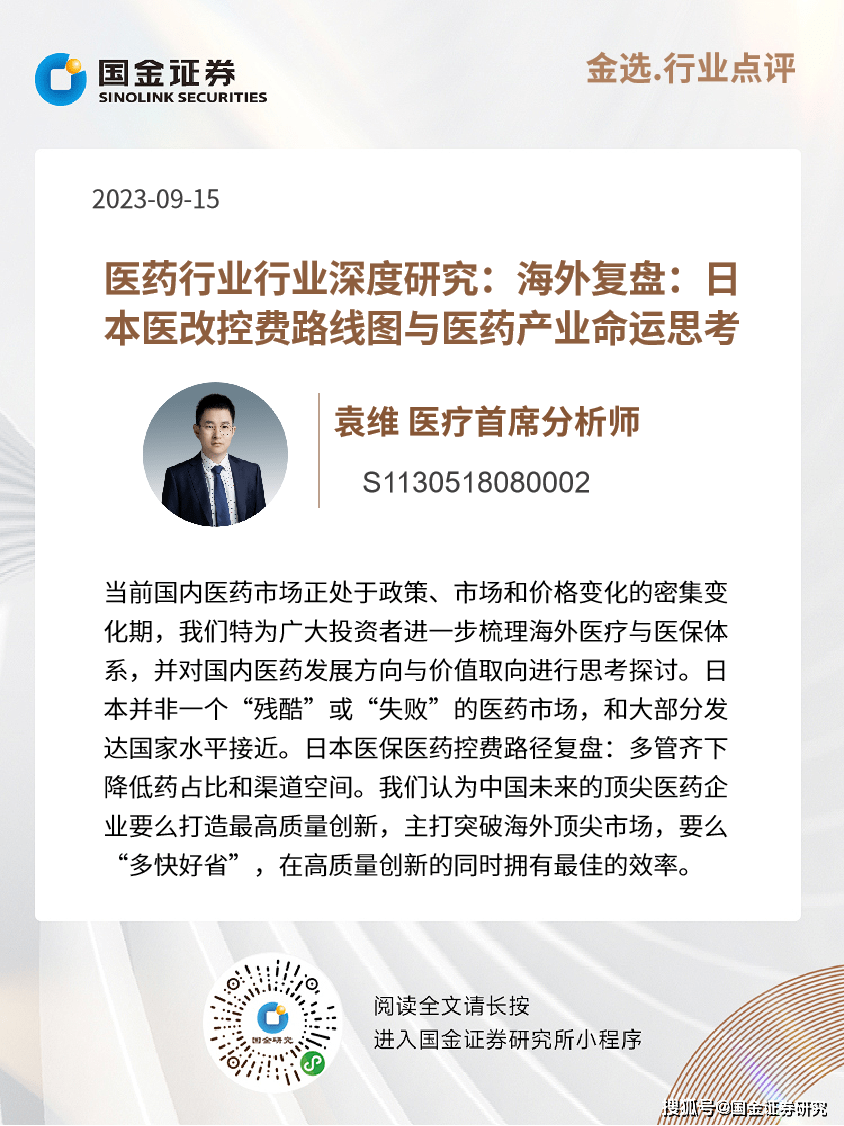 简单对标美国的研究思维有时并不可取:美国医药体制有着非常高的特殊性,支付力极强,创新力顶尖,但效率差且经济负担沉重。“高举高打”的美式医疗体制和医药创新体制,不仅对于发展中国家过于“奢侈”,其实对日本、欧洲和全世界大部分国家来说都不具备可复制性。相比之下,对日本医保控费与医药发展的路径梳理具有十分突出的意义,既能为国内未来医药政策预测提供参考,也能从日本医药企业兴衰中汲取个股投资经验。