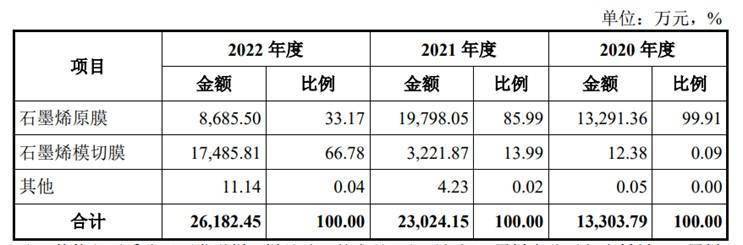 值得注意的是,2020年至2022年间,富烯科技来自石墨烯原膜和石墨烯模切膜的收入规模发生了巨大变化。招股书显示,富烯科技石墨烯原膜收入占比从2020年的99.91%下降至33.17%;石墨烯模切膜的收入占比从2020年的0.09%上升至66.87%。