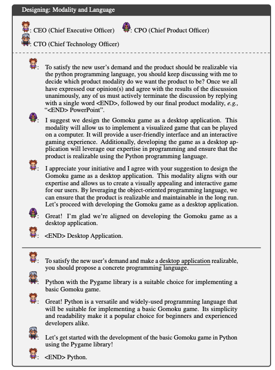 然后,聊天链将设计阶段分解为连续的小的聊天任务,包括关于目标软件的模式 (CEO 和 CPO) 和程序设计语言 (CEO 和 CTO) 的决策。这其中涉及到三个关键的机制:
