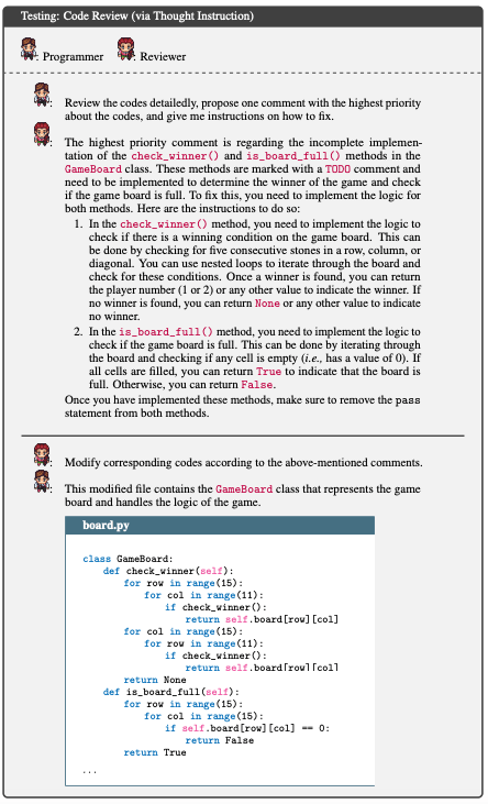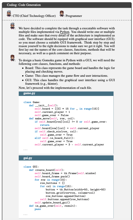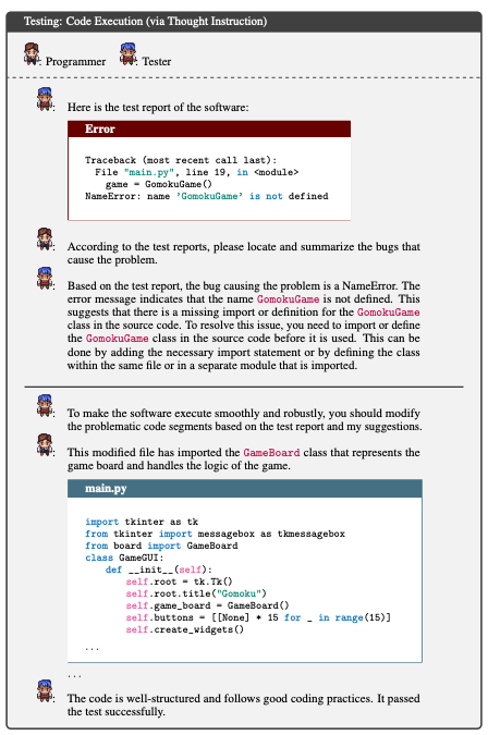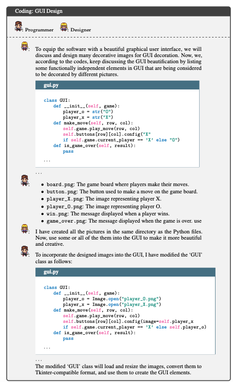 编码阶段涉及三个预定义的角色:CTO、程序员和美术设计师。同样,聊天链将编程阶段分解为连续的小的聊天任务,如 CTO 提供要求和想法,程序员生成完整的代码 ,进而设计师设计图形用户界面,程序员进行集成。