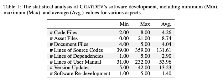 除了以上示例之外,研究人员表示,此次实验分析 了Chatdev 所生成的 70 款所有软件,与此同时,他们还对这些软件进行了统计分析,包括总对话次数、消耗的 token、软件文件、图像资产和版本更新。