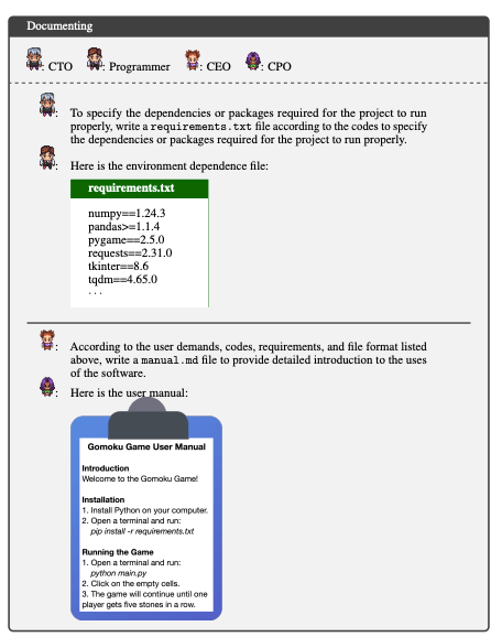 最终,在设计、编码和测试阶段之后,ChatDev 雇佣了四个代理 (CEO、CPO、CTO 和程序员)来生成软件项目文档。使用大型语言模型,生成了用户手册。
