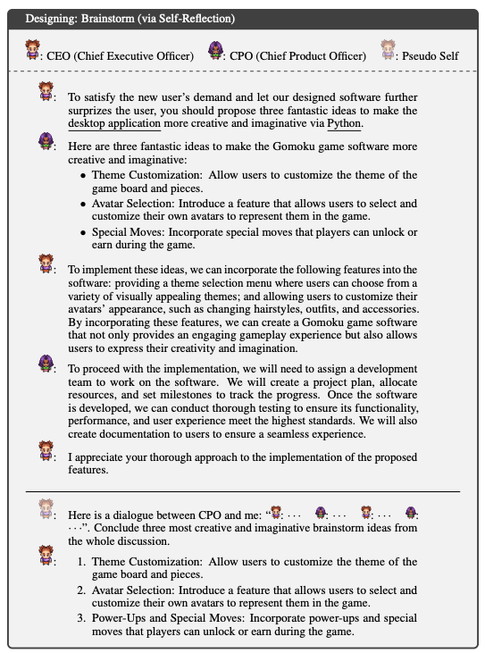 当从人类客户端接收到一个开发游戏的需求后,首先进入该虚拟软件开发公司内部的设计阶段,这个阶段有三个预定义角色参与,分别是:CEO (首席执行官)、CPO (首席产品官)和 CTO (首席技术官)。