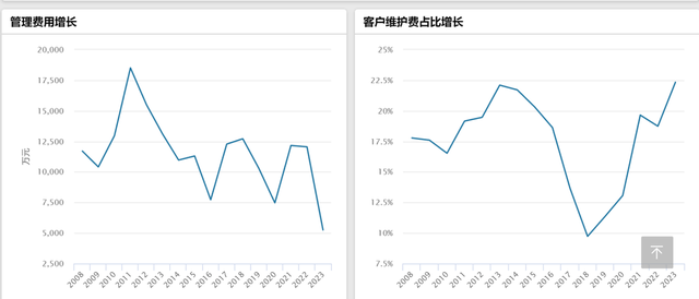 整体来看,wind数据显示,近年来东吴基金收取的管理费用是波折向下的趋势,而客户维护费却呈现上升的趋势,2018年客户维护费占比9.73%,到了2023年上半年末占比增长至22.34%。