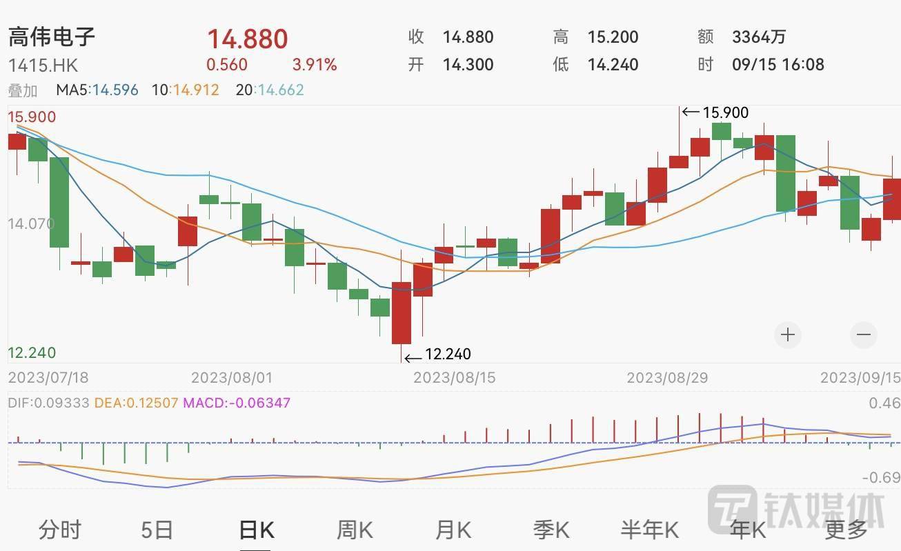 钛媒体APP注意到,已连涨两个交易日,市值增加逾7亿元,截至9月15日港股收盘,公司股价报收14.88港元,涨3.91%,成交额为3363.96万港元,当前公司总市值约126.41亿港元。