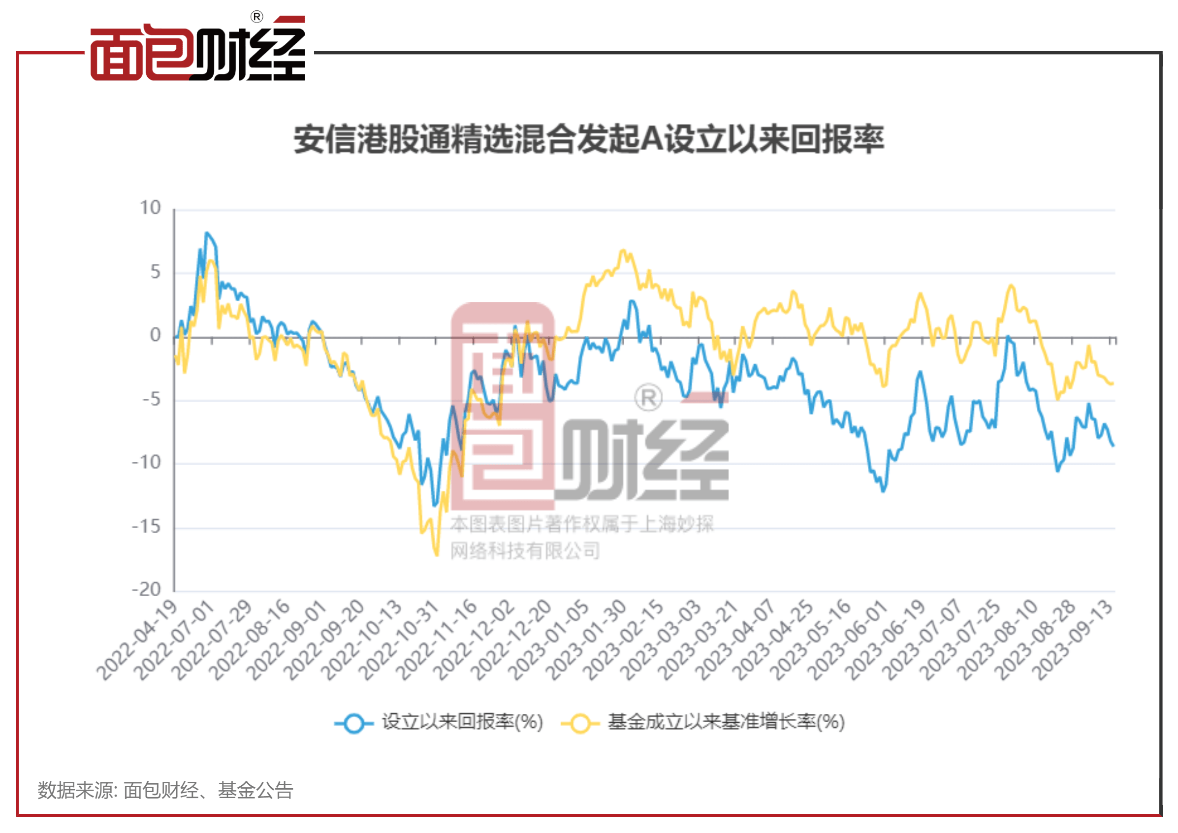 数据显示,安信港股通精选混合发起A近1年回报为-5.94%,跑输业绩基准超5个百分点,同类排名577/3330;成立至今,该基金净值累计亏损8.63%,跑输业绩基准超4个百分点,同类排名1198/3003。