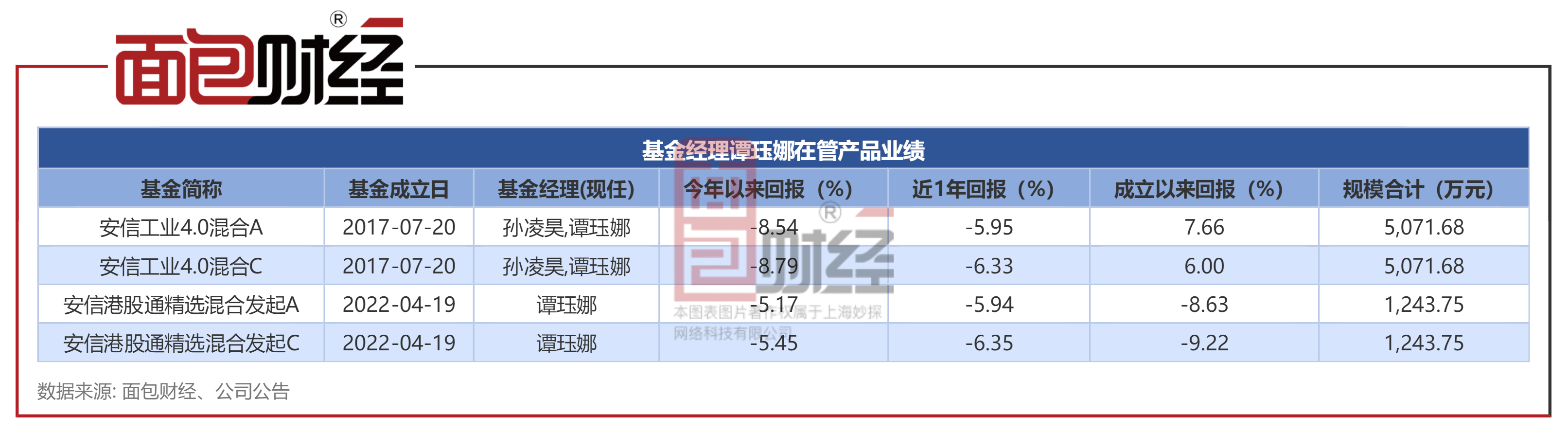 谭珏娜还参与管理了安信工业4.0混合A,该基金今年以来净值回撤8.53%,成立6年累计回报7.66%,均跑输同期业绩比较基准。