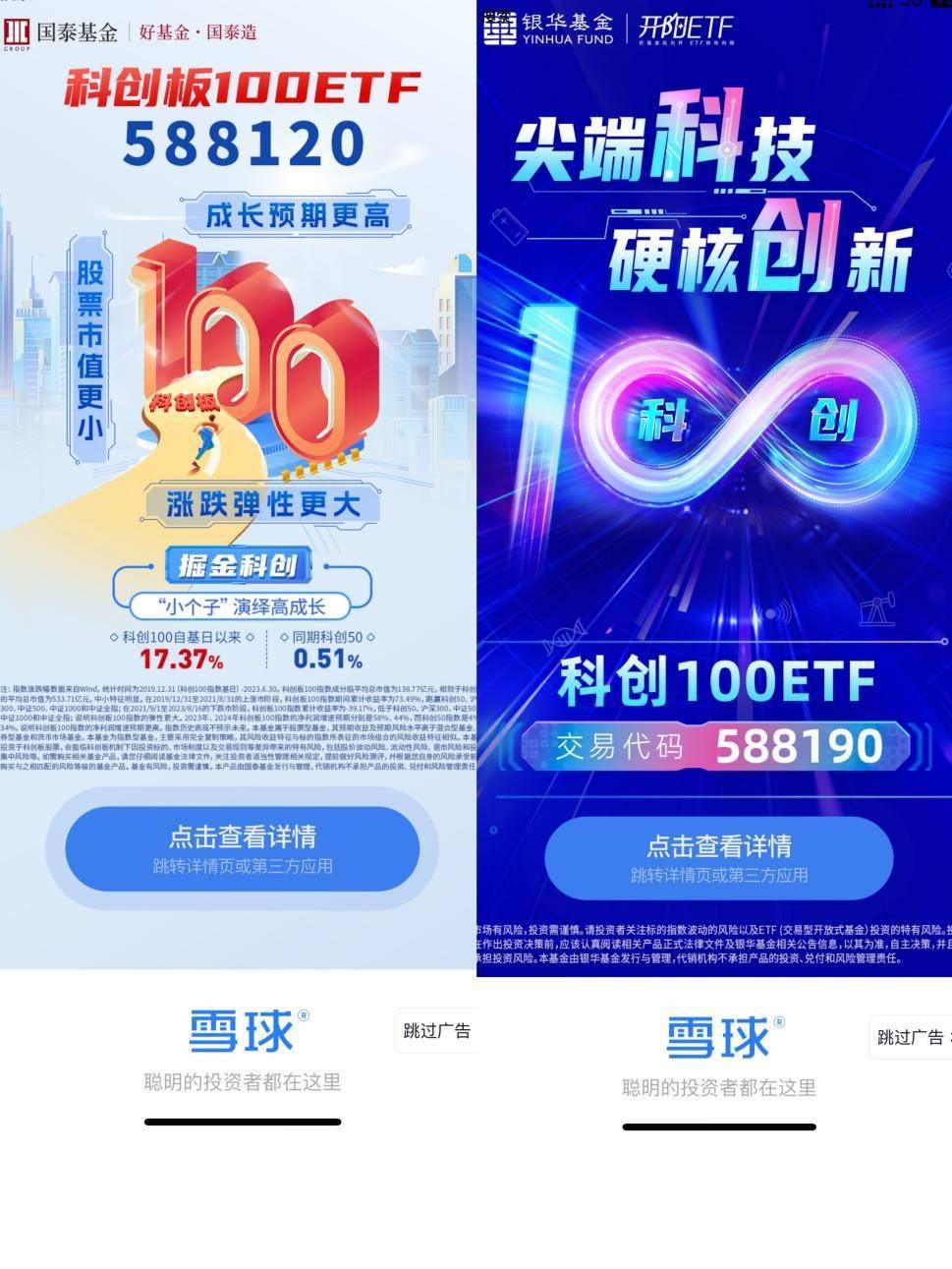 例如,作为较为精准股民交流平台,雪球APP今天的开屏广告是银华上证科创板ETF、国泰上证科创板ETF和鹏华上证科创板ETF 轮番登台。不仅如此,该平台的热门榜前三也被科创100ETF牢牢占据。