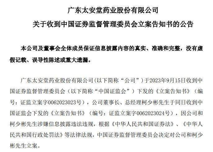 9月15日晚间*ST太安公告,公司及公司董事长、总经理柯少彬当日均收到中国证监会下发的《立案告知书》,因公司和柯少彬涉嫌信息披露违法违规,中国证监会决定对公司和柯少彬立案。