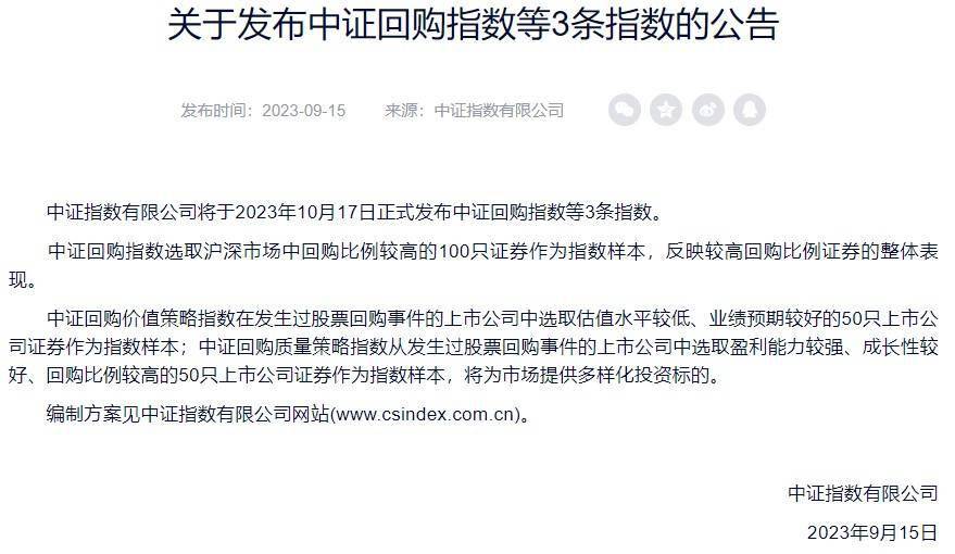 智通财经APP获悉,9月15日,中证指数发布公告称,中证指数有限公司将于2023年10月17日正式发布中证回购指数等3条指数。其中,中证回购指数选取沪深市场中回购比例较高的100只证券作为指数样本,反映较高回购比例证券的整体表现。
