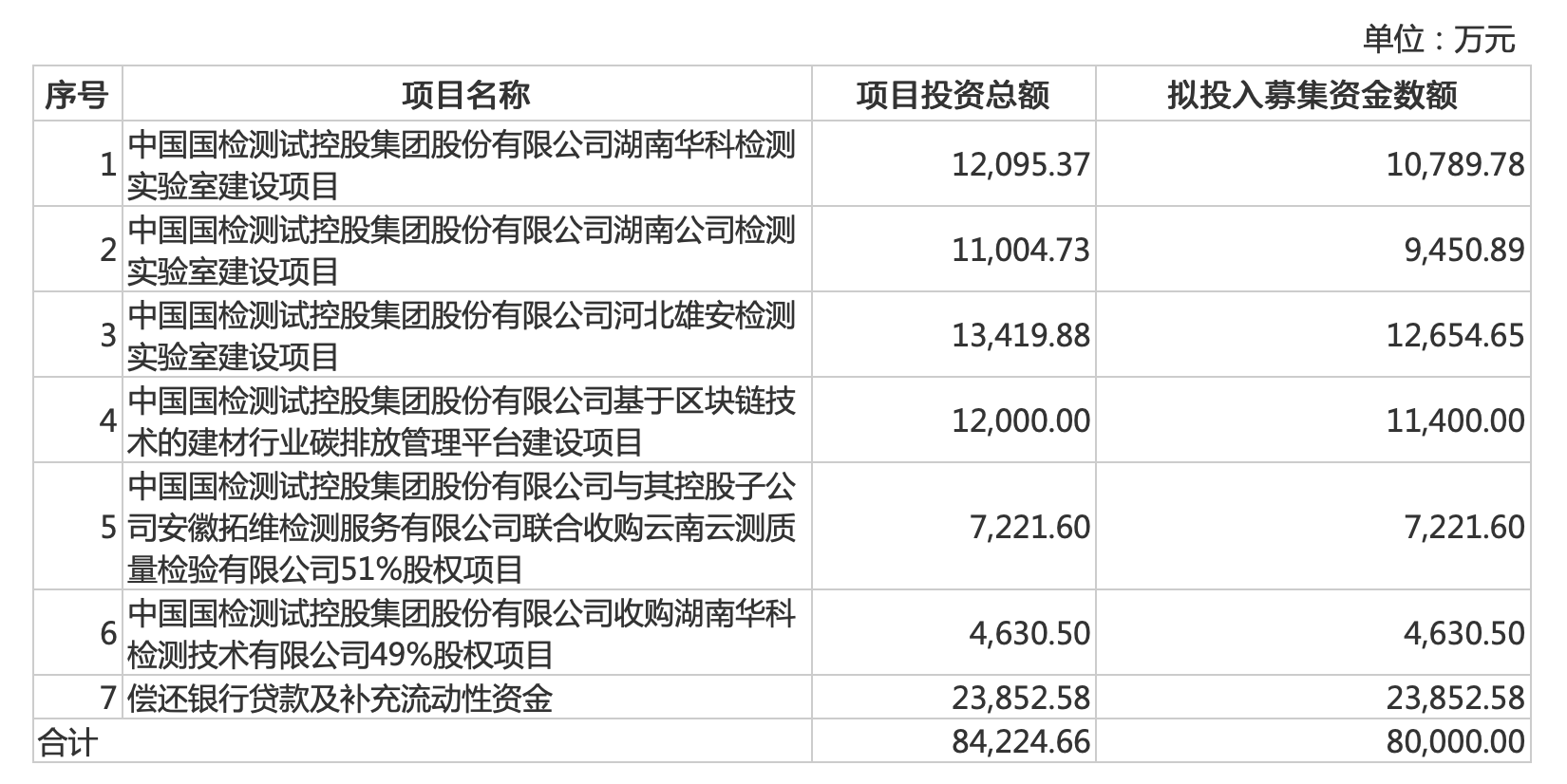 本次募资除补流外,其他资金均将投入检测相关领域。募投项目包括湖南华科检测实验室建设项目、湖南公司检测实验室建设项目、河北雄安检测实验室建设项目、基于区块链技术的建材行业碳排放管理平台建设项目、联合收购云南云测质量检验有限公司51%股权项目、收购湖南华科检测技术有限公司49%股权项目、偿还银行贷款及补充流动性资金。