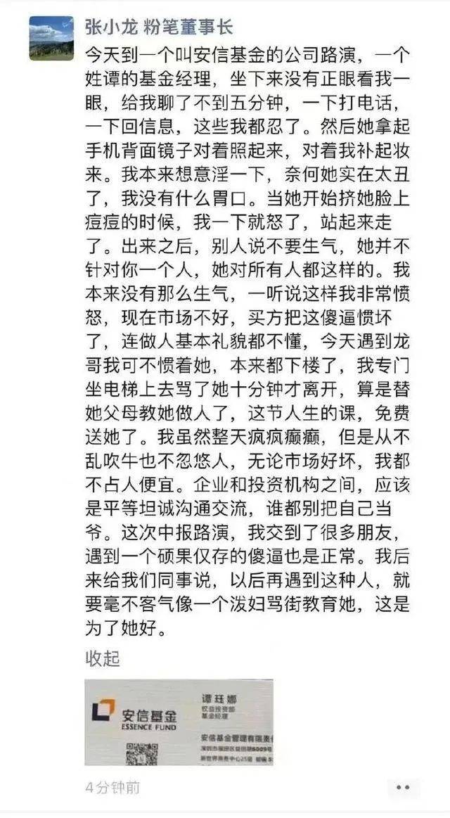 近日,港股上市公司粉笔董事长张小龙在朋友圈发文称,路演遇到谭姓基金经理不礼貌对待。但该基金经理在朋友圈回应称,两人存在误会。