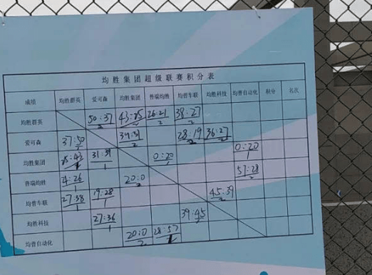 一张在场地张贴的“均胜集团超级联赛积分表”显示,此次比赛共计有七支队伍,分别为均胜群英、爱可森、均胜集团、普瑞均胜、均普车联、均胜科技、均普自动化。这似乎像是均胜集团旗下各个子公司之间的比赛,除爱可森外,其他队伍全部带有均字。