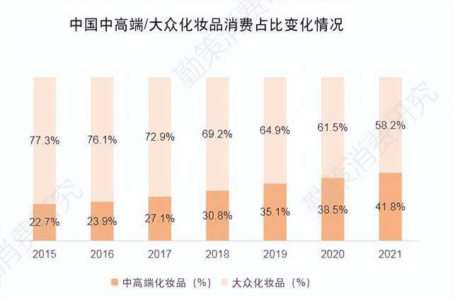 然而,化妆品价格超过黄金,并不稀奇。尤其是高端化趋势下,不仅国际大牌价格高昂,不少国内品牌也在涨价。从平安证券、勤策消费研究相关数据,不难看出中高端化妆品正在挤压大众化妆品市场份额。
