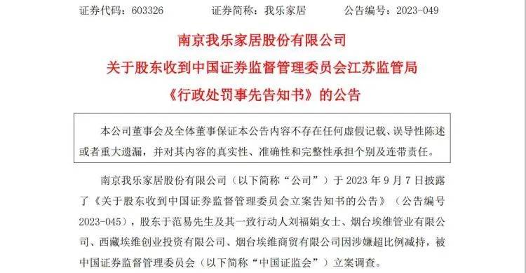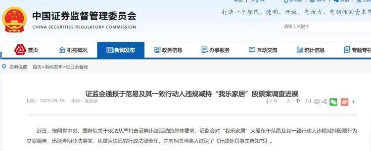 证监会公告称,近日,按照党中央、国务院关于依法从严打击证券违法活动的总体要求,证监会对“我乐家居”大股东于范易及其一致行动人违规减持股票行为立案调查,迅速查明违法事实,从重从快追究行政法律责任,并向相关当事人送达了《行政处罚事先告知书》。