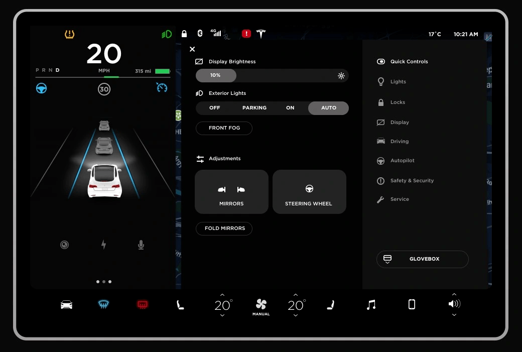 在车机上,特斯拉基于 Linux 编写了自己的操作系统。这让特斯拉可以不再依赖于软件供应商,并且将车辆的软硬件全部集中到一块屏幕上统一管理。