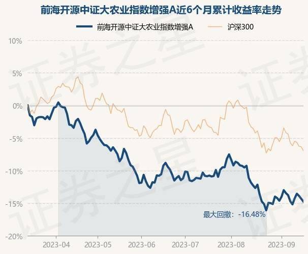 9月15日,前海开源中证大农业指数增强A最新单位净值为1.0244元,累计净值为1.0244元,较前一交易日下跌0.51%。历史数据显示该基金近1个月下跌2.79%,近3个月下跌6.04%,近6个月下跌14.69%,近1年下跌17.5%。该基金近6个月的累计收益率走势如下图: