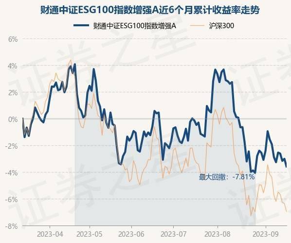 9月15日,财通中证ESG100指数增强A最新单位净值为1.7837元,累计净值为2.2725元,较前一交易日下跌0.59%。历史数据显示该基金近1个月下跌3.66%,近3个月下跌3.03%,近6个月下跌3.57%,近1年下跌0.83%。该基金近6个月的累计收益率走势如下图: