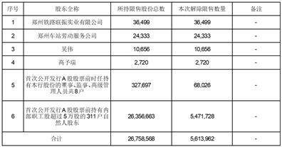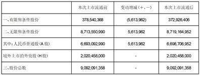 (二)本次限售股上市流通数量为5,613,962股,占本行A股股份的0.0794%,占本行总股份的0.0617%,占本次解除股份限售后无限售条件股份的0.0644%。