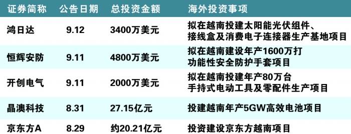 “随着‘一带一路’建设的深入推进,国内光伏组件头部企业多数在越南投资建厂。同时,公司主营业务所属3C消费电子行业的全球产业链格局发生变化,核心客户的供应链往东南亚迁移,特别呈现在越南聚集的趋势。”9月12日,鸿日达表示,拟在越南投资约3400万美元,建设太阳能光伏组件、接线盒及消费电子连接器生产基地。