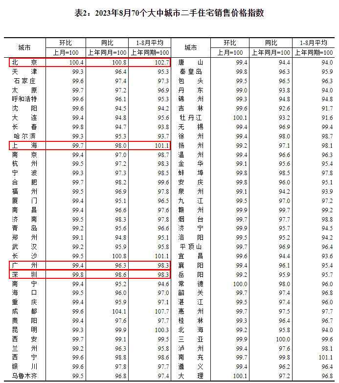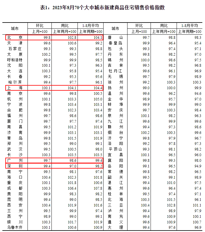 8月新房,四个一线城市中,北京、广州、深圳分别环比下跌0.2%、0.3%和0.6%,上海环比微升0.1%。