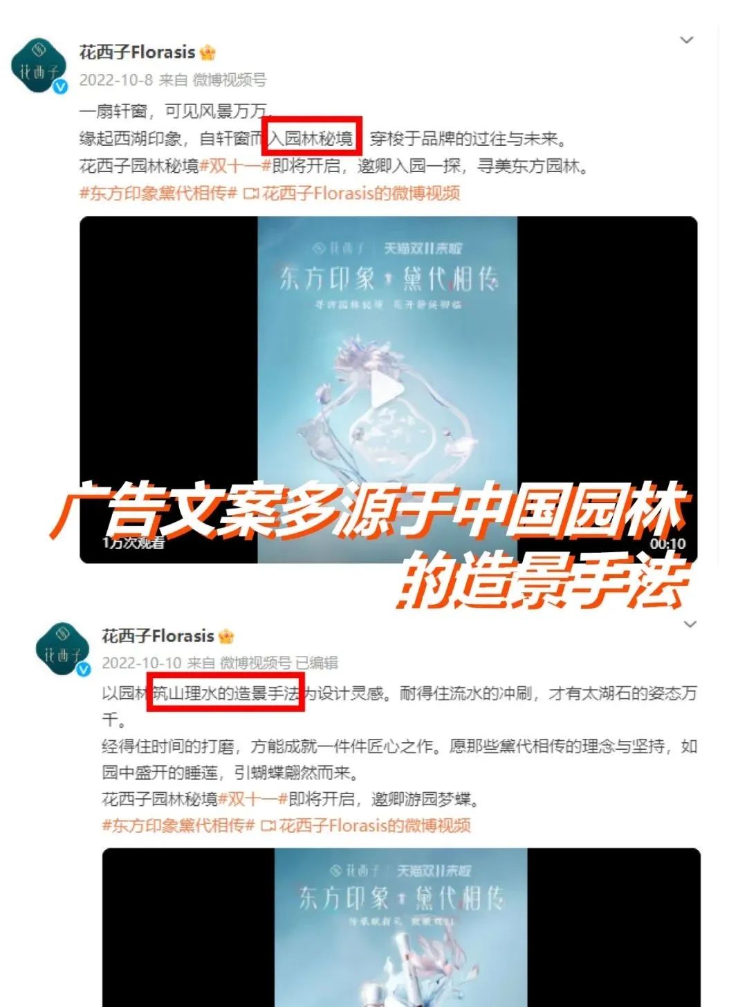 其实仔细翻翻花西子的官方微博,我们也可以发现其广告文案多数选自中国古典园林的造景手法,果然景观人是会写设计说明的(忽悠人很有一套)