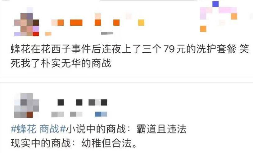 有网友发现,在花西子事件后,同为国货品牌的蜂花在抖音官方旗舰店连夜上架3款洗护套餐,所包含的洗护产品净含量有5斤半之多,售价均为79元,与李佳琦直播间花西子眉笔的价格相同。