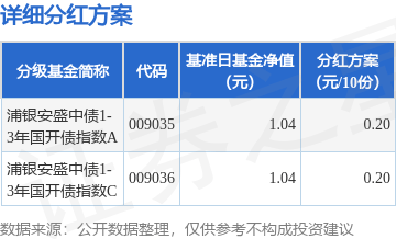 9月16日发布《浦银安盛中债1-3年国开行债券指数证券投资基金2023年度分红公告》。本次分红为2023年度的第1次分红。公告显示,本次分红的收益分配基准日为9月9日,详细分红方案如下: