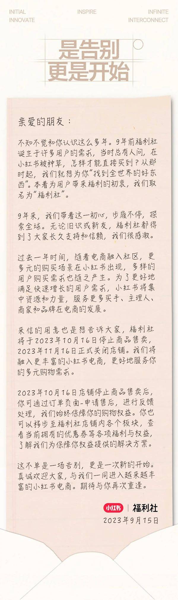 快科技9月16日消息,日前,小红书自营店铺“福利社”突然发布致用户的一封信《是告别,更是开始》,宣布“福利社”将于10月16日停止商品售卖,11月16日正式关闭店铺。