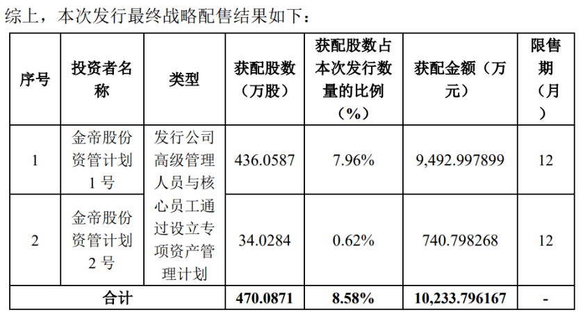 其中,战略配售发行数量为470.0871万股,占比8.58%,该部分股份的认购方为员工持股平台金帝股份资管计划1号、2号,限售期12个月。这两项资管计划主要是“发行公司高管与核心员工设立专项资产管理计划”。