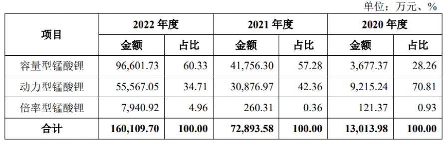 招股书显示,博石高科是一家专注于锰基正极材料研发、生产和销售的高新技术企业,报告期内公司主要产品为锰酸锂,包括容量型锰酸锂、动力型锰酸锂、倍率型锰酸锂。“根据EVtank 和鑫椤资讯等公开数据,公司2021年、2022年国内锰酸锂出货量位居行业第一位。”
