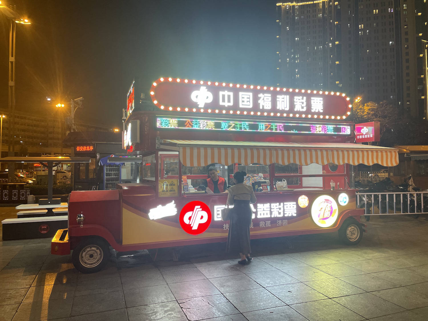 9月的周末傍晚,他照例点亮了摊位招牌——被商业综合体与小吃街包围的彩票销售摊位,招牌与奥运五环相同配色,大片的白色块在夜晚特别显眼。
