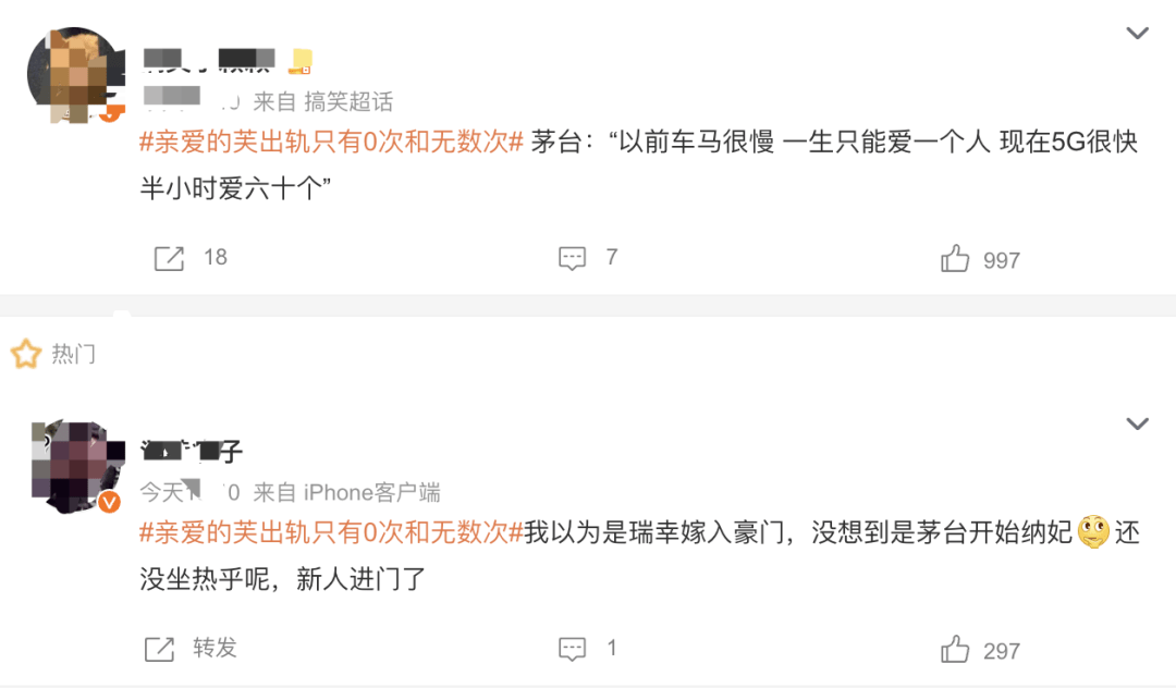 在茅台酒心巧克力火爆开卖之后,词条“亲爱的芙出轨只有0次和无数次”出现在某社交平台热搜上。网友频频抛梗,“瑞幸:亲爱的芙,出轨只有0次和无数次”“茅台:以前车马很慢 一生只能爱一个人 现在5G很快 半小时爱六十个”“我以为是瑞幸嫁入豪门,没想到是茅台开始纳妃,还没坐热乎呢,新人进门了”。