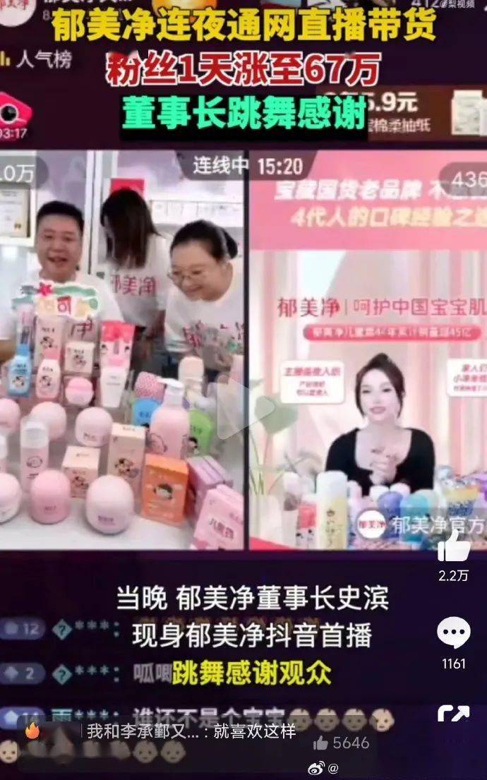 9月14日,郁美净官宣全面入驻抖音和小红书,在“终于通网”的自嘲和调侃中迅速获得关注。当日下午2点左右,郁美净在抖音开启首场直播,一口气播到次日凌晨近6点。郁美净董事长史滨也现身直播间,跳舞感谢观众。