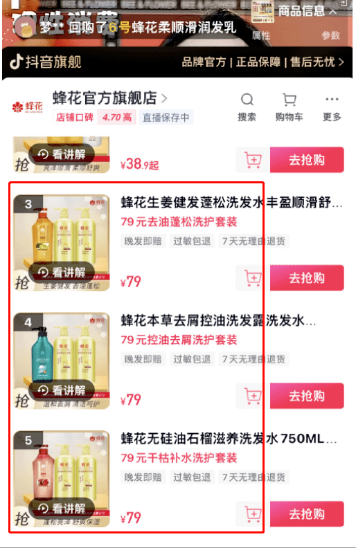 9月11日晚,在蜂花直播间,主播连夜上架了3款79元洗护套装,并称“79元可以买5斤半”,这三款套装均包括相同的2瓶1L的护发素、1瓶750ML不同功效的洗发水。